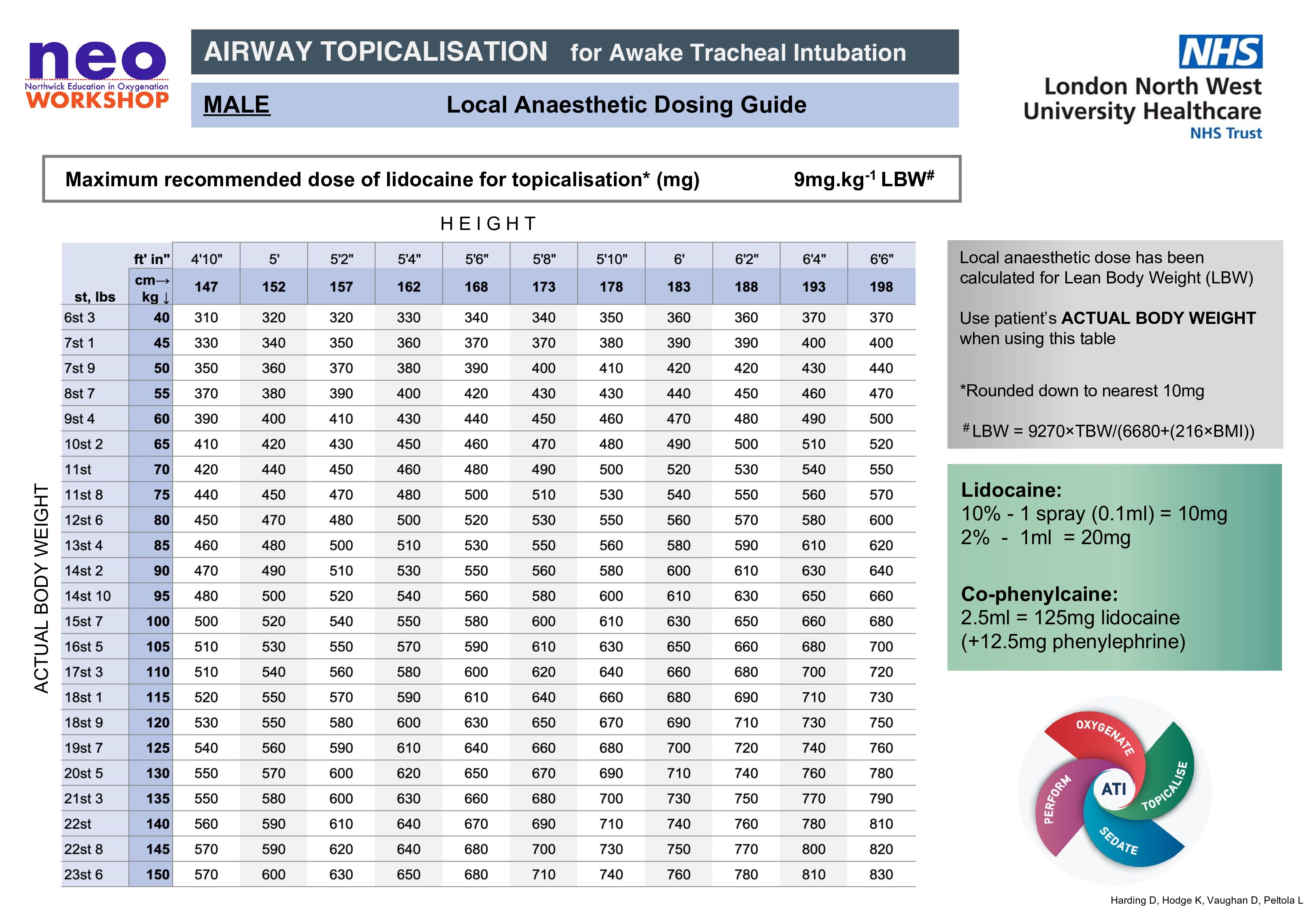 Max lidocaine dose: 9mg/kg LBW co-phenylcaine ( 125mg ) spray to turbinates of selected nostril 2% lidocaine ( 5ml, 100mg ) via MAD in selected nostril 10% lidocaine ( 10x sprays, 100mg ) via atomiser to oropharynx 2% lidocaine ( 5ml, 100mg ) in 5ml syringe via MADgic x1-2 Check for successful topicalisation with suction catheter Optional Final topicalisation when vocal cords directly in view of scope Reassure patient throughout each step of procedure Encourage gargling and swallowing of local anaesthetic, instead of spitting